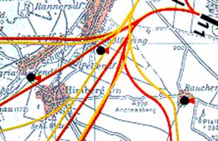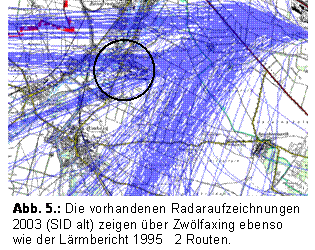 ![]() ![]() Abb. 4: Lärmbericht 1995. Abflug Piste 29 = rot. Die roten Linien zeigen vor der Mediation 2 Abflugrouten über Zwölfaxing. |