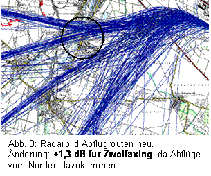 ![]() Rechnung Flughafen: <leiser Nachgemessen: <lauter Abb. 2: Neue Routen ab 18. März 2004 geflogen. Messung Sommer 2003: 55 dB (vor Teilvertrag). Messung Sommer 2004: 56,3 dB (nach Teilvertrag). |